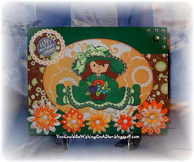 I used a new image from Leigh called Mushroom House. It was colored with Copics, then Stickles were added to give some sparkle. The background was created by using the Copics to add dots. The ribbon is from Michaels. Flower on the bottom left is from Prima. The flower on the upper right was created by placing numerous pearls in a circle around a pink gem. The "home sweet home" sentiment is from 7 Gypsies.